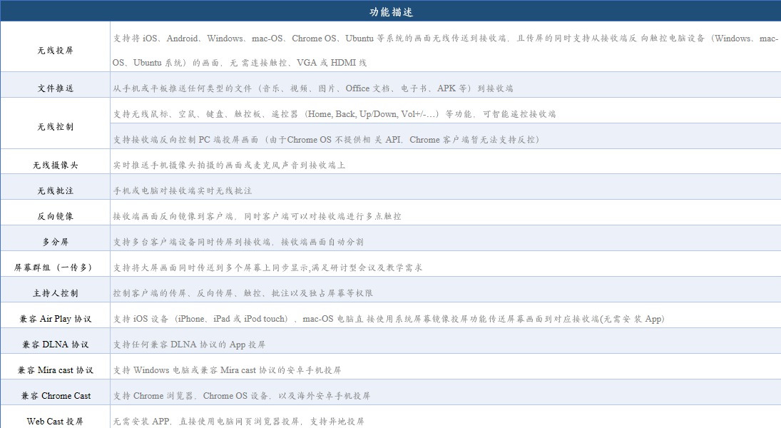 设备内置的无线投屏系统,功能卓越,旨在为用户提供高效、便捷且安全的投屏服务。该系统广泛兼容多平台设备,可灵活应用于教育、
